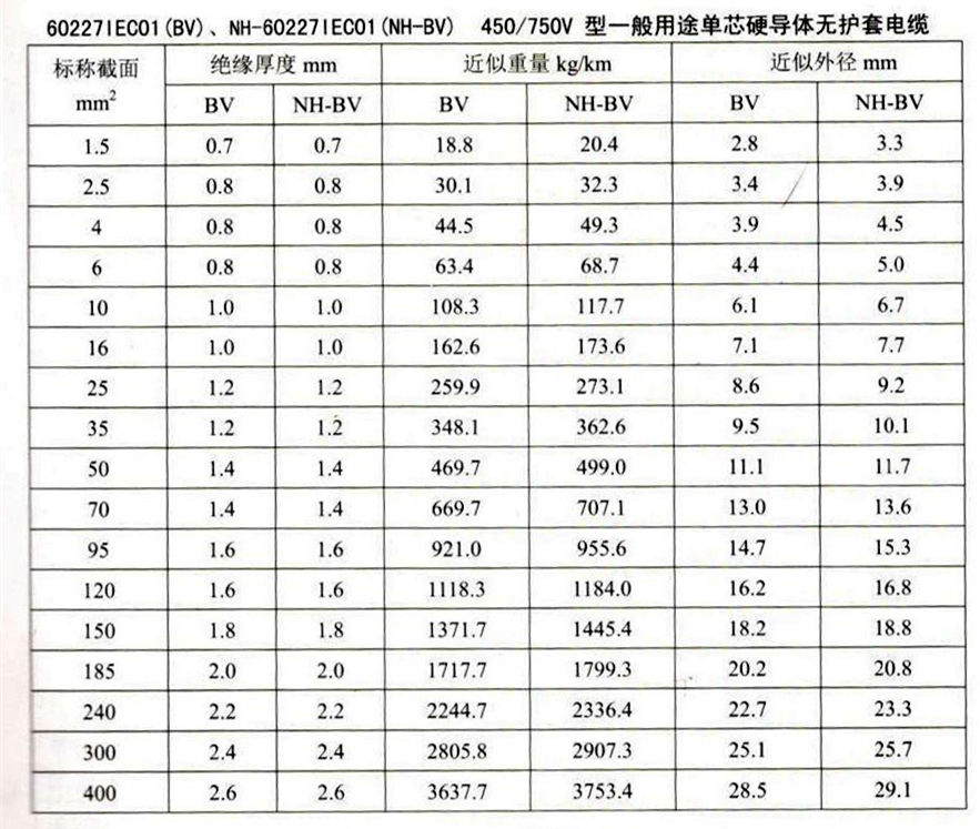 众邦60227IEC01(BV)、NH-60227IEC01(NH-BV) 450/750V型一般用途单芯硬导体无护套电缆规格参数/电缆型号与尺寸对照表